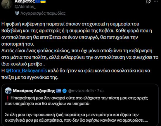 Μακάριος Λαζαρίδης: Το retweet που «στέλνει» τη Ντόρα Μπακογιάννη για