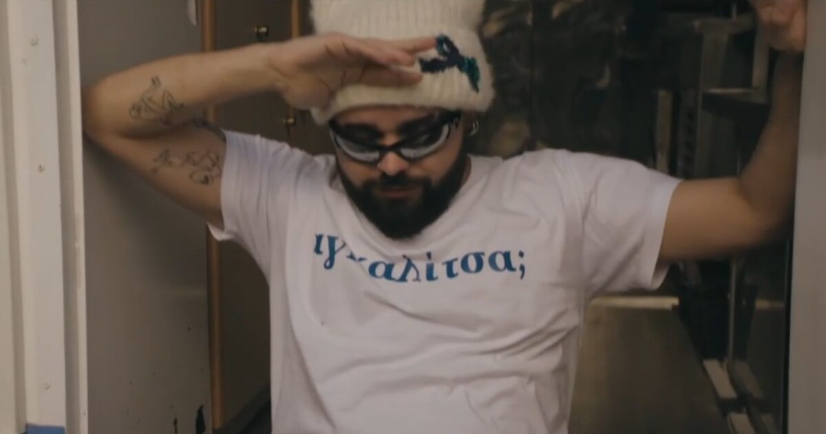 Ο εκπρόσωπος της Ελλάδας στη Eurovision 2026 διατήρησε τα μαύρα γυαλιά ηλίου και τον σκούφο, που φοράει στις εμφανίσεις για την προώθηση του κομματιού του «Ferto», ολοκληρώνοντας την εικόνα του με ένα λευκό T-shirt που έγραφε «αγκαλίτσα;».