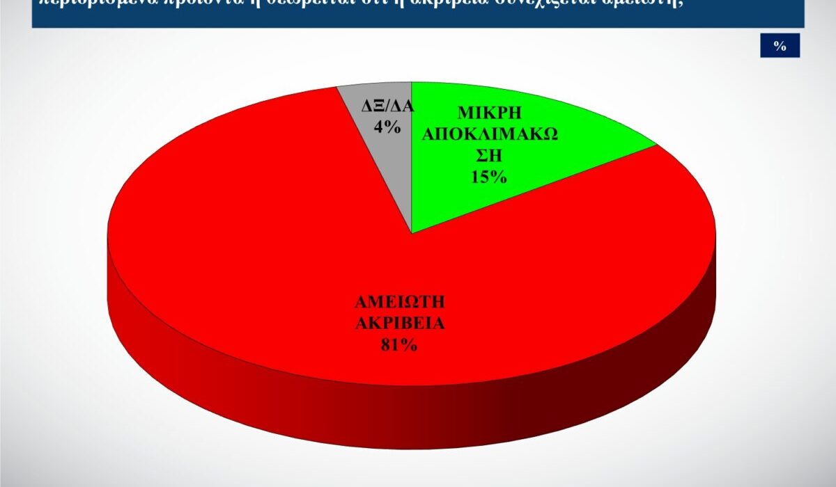 Στην ερώτηση αν έχουν παρατηρήσει αποκλιμάκωση στις τιμές, οι πολίτες απάντησαν στο πλαίσιο της δημοσκόπησης της Alco σε ποσοστό 81% ότι συνεχίζεται αμείωτη η ακρίβεια.