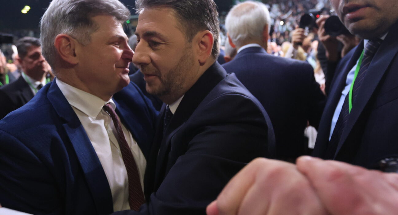 Ο Νικόλας Φαραντούρης με τον Νίκο Ανδρουλάκη στο 4ο Τακτικό Συνέδριο του ΠΑΣΟΚ (Πηγή φωτογραφίας: ΓΙΩΡΓΟΣ ΚΟΝΤΑΡΙΝΗΣ / EUROKINISSI)